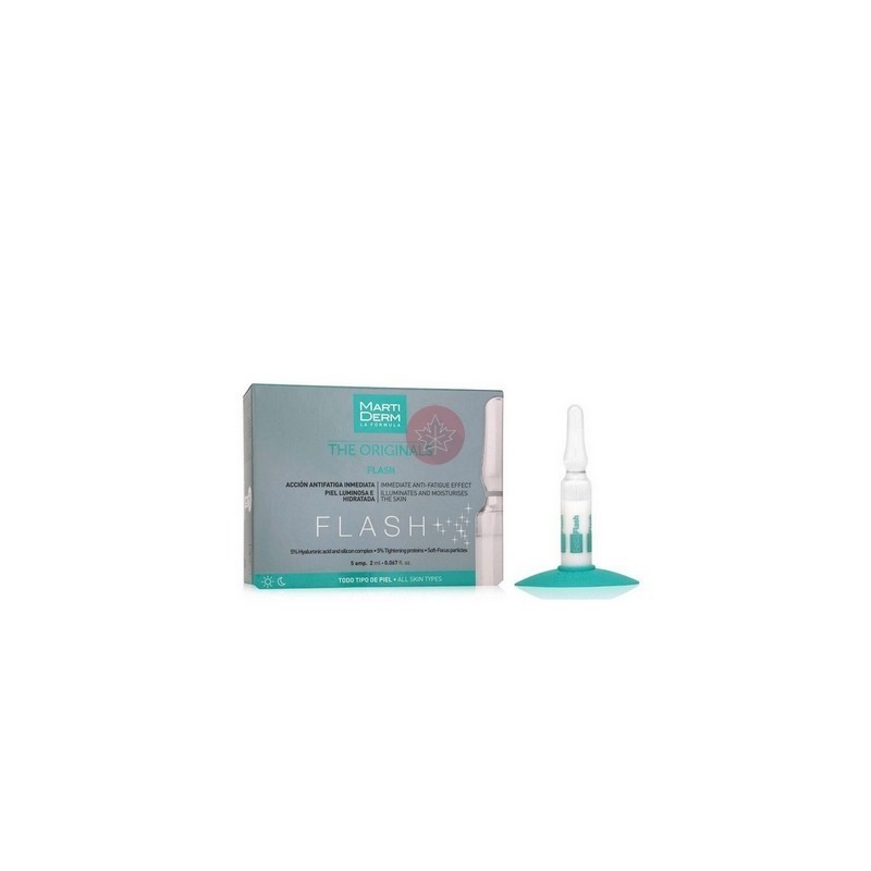 MARTIDERM FLASH 5 AMPOLLAS Martiderm Flash contiene una fórmula para una piel deslumbrante y lista para un maquillaje perfecto y duradero. Acción inmediata antifatiga perfecta para ocasiones especiales. INDICACIONES - Indicado para todo tipo de piel. - Elasticidad y flexibilidad. - Luminosidad y borrado óptico de las arrugas. - Firmeza. UTILIZACIÓN Aplicar en rostro y cuello después del tratamiento cosmético habitual.