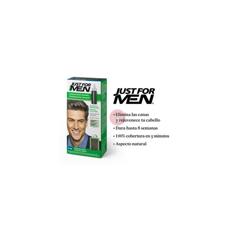 JUST FOR MEN COLORANTE CASTAÑO MEDIO NATURAL CHAMPU 30 ML Just for Men Champú actúa sólo sobre las canas, cubriéndolas con tonos que se igualan con tu color natural de pelo. Actúa fácilmente en sólo 5 minutos, y puede durar hasta 6 semanas. La fórmula de Just For Men no contiene amoníaco. INDICACIONES - Contiene diaminofenol, resorcinol, alfa-naftol y agua oxigenada. - Puede provocar reacción alérgica. - Evitar el contacto con los ojos. - En caso de contacto, lavarlos con abundante agua fría. UTILIZACIÓN Mezclar los productos y agitar. Aplicar sobre cabello seco y dejar actuar durante 5 minutos. Aclarar y secar.