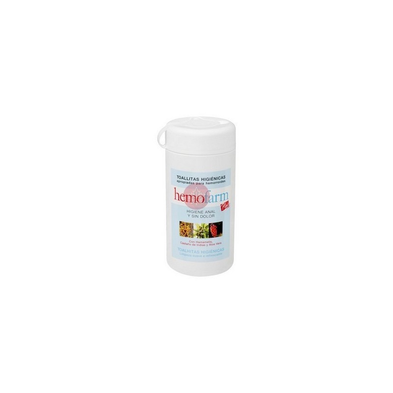 HEMOFARM PLUS TOALLITAS BOTE 60 UDS Hemofarm Plus son toallitas húmedas destinadas a la higiene y cuidado de la zona anal cuando esta presenta fisuras o hemorroides. INDICACIONES - Bote de 60 toallitas húmedas. - Hamamelis, castaño de Indias, aloe vera y cloruro de benzalconio. - Limpian sin irritar y proporcionan la calma y el frescor necesarios. UTILIZACIÓN Utilizar después de cada deposición las toallitas que sean necesarias.