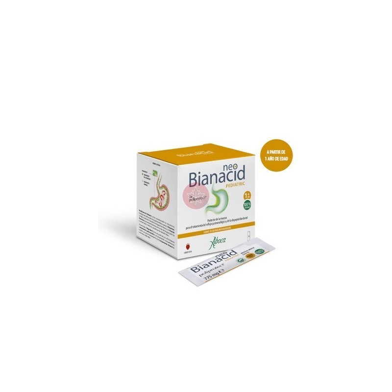 NeoBianacid Pediatric, es un sobre granulado en monodosis que ayuda a contrarrestar la acidez, el reflujo y las dificultades digestivas. Est enriquecido con la patente Poliprotect, fuente de polisacarídicas y flavonoides que actúan como antioxidante combatiendo la irritación causada por los radicales libres. La fórmula de este tratamiento es rica en moleculares vegetales y minerales procedentes de agricultura org nica responsable con el medio ambiente.